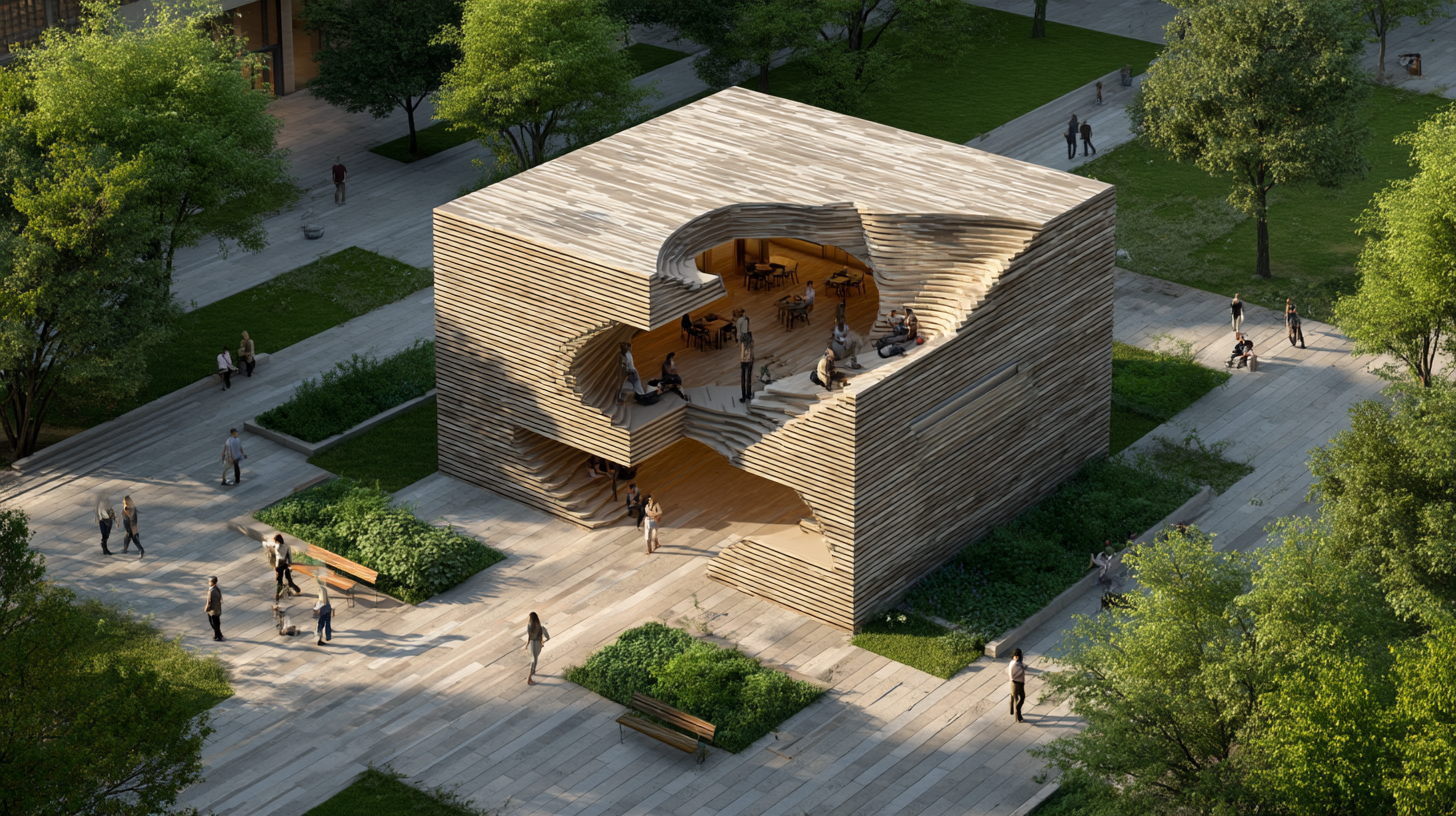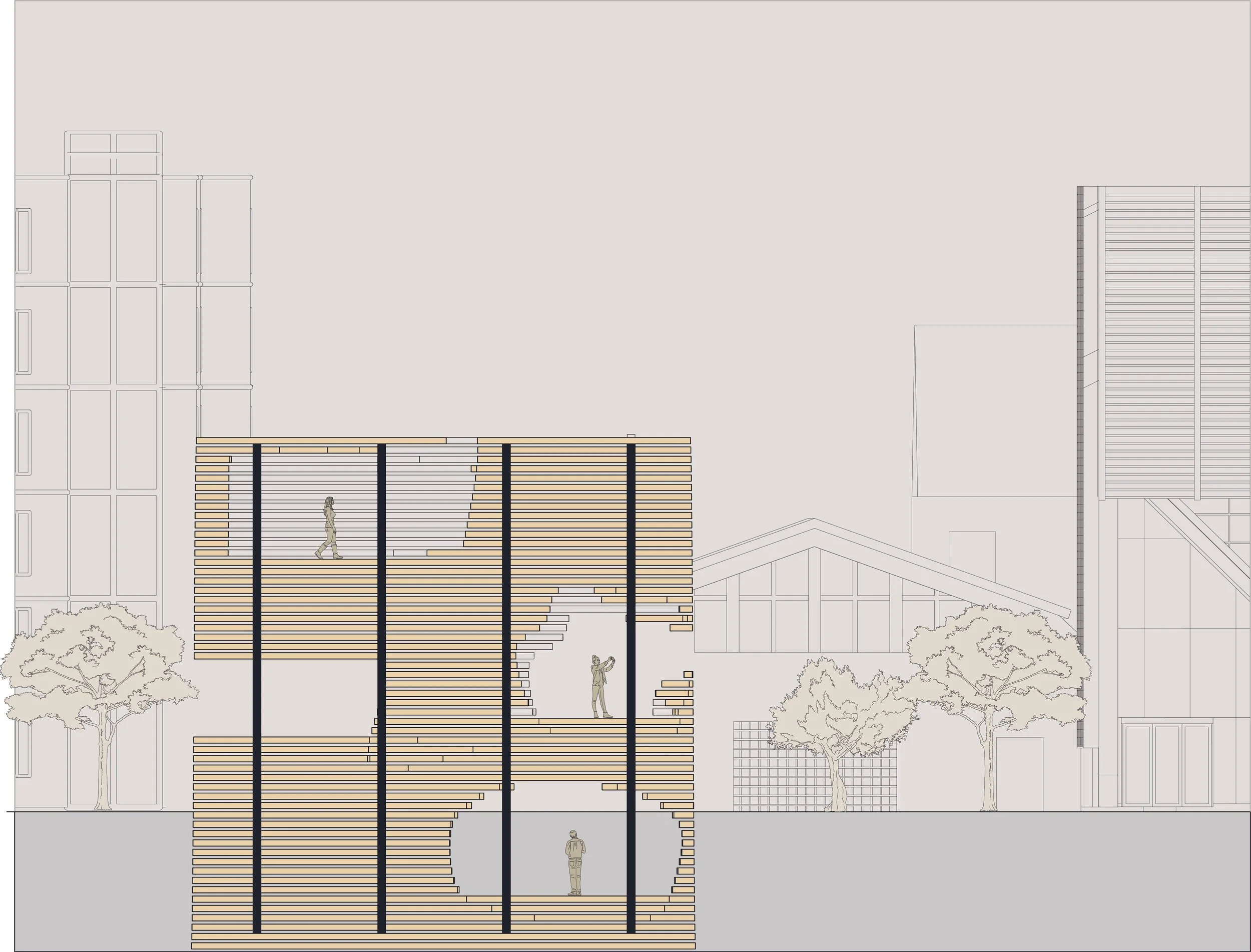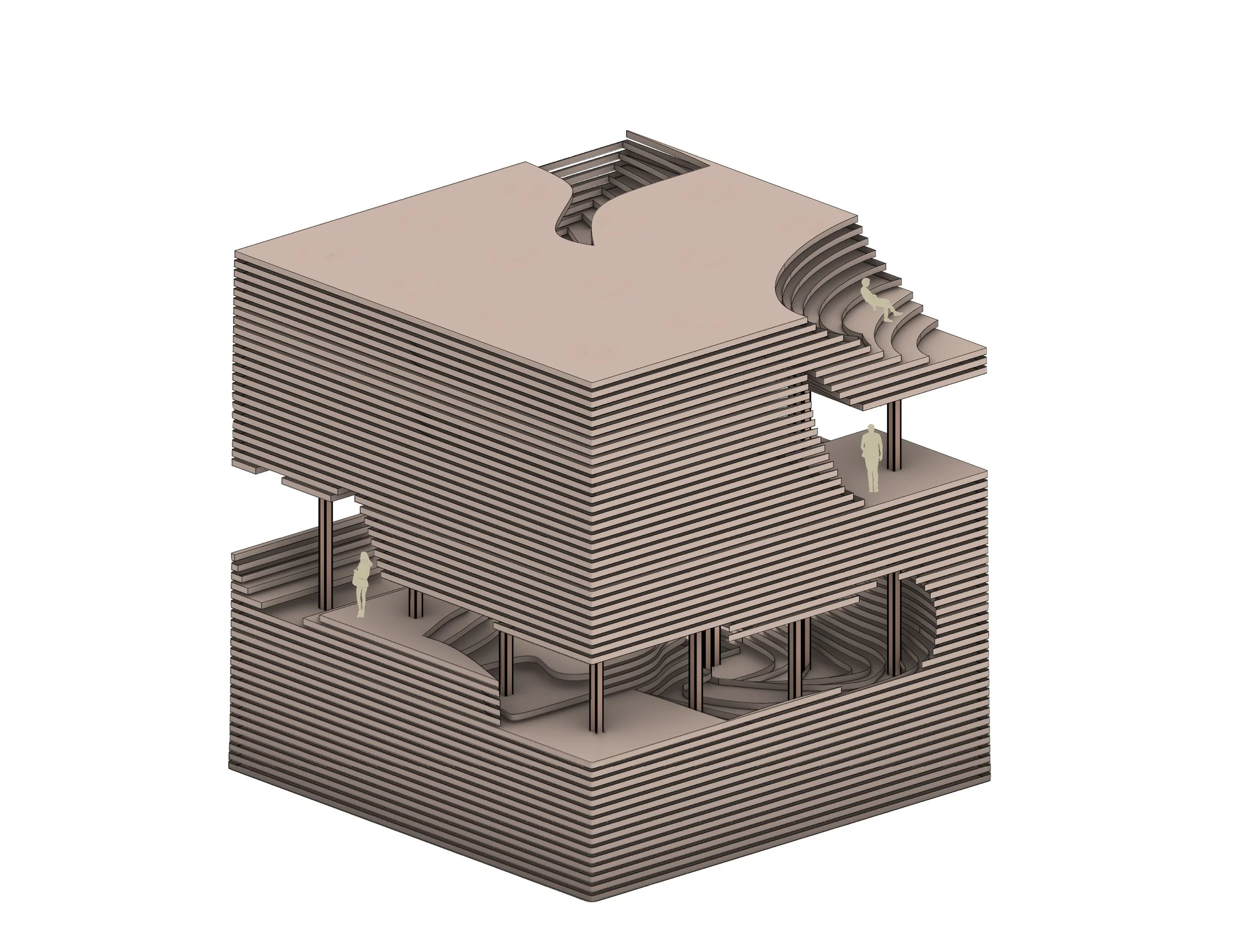 A semester-long architectural project developed for the University of Toronto’s St. George Campus. The pavilion is conceived as a composition of stacked slabs with carved voids, generating fluid spatial connections that encourage interaction, rest, and collaborative study among students from diverse cultural backgrounds.