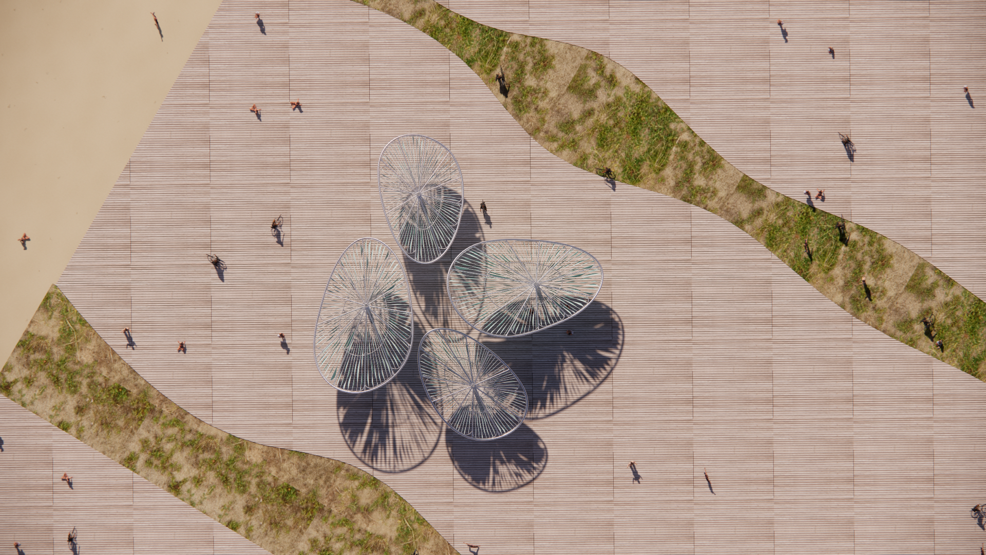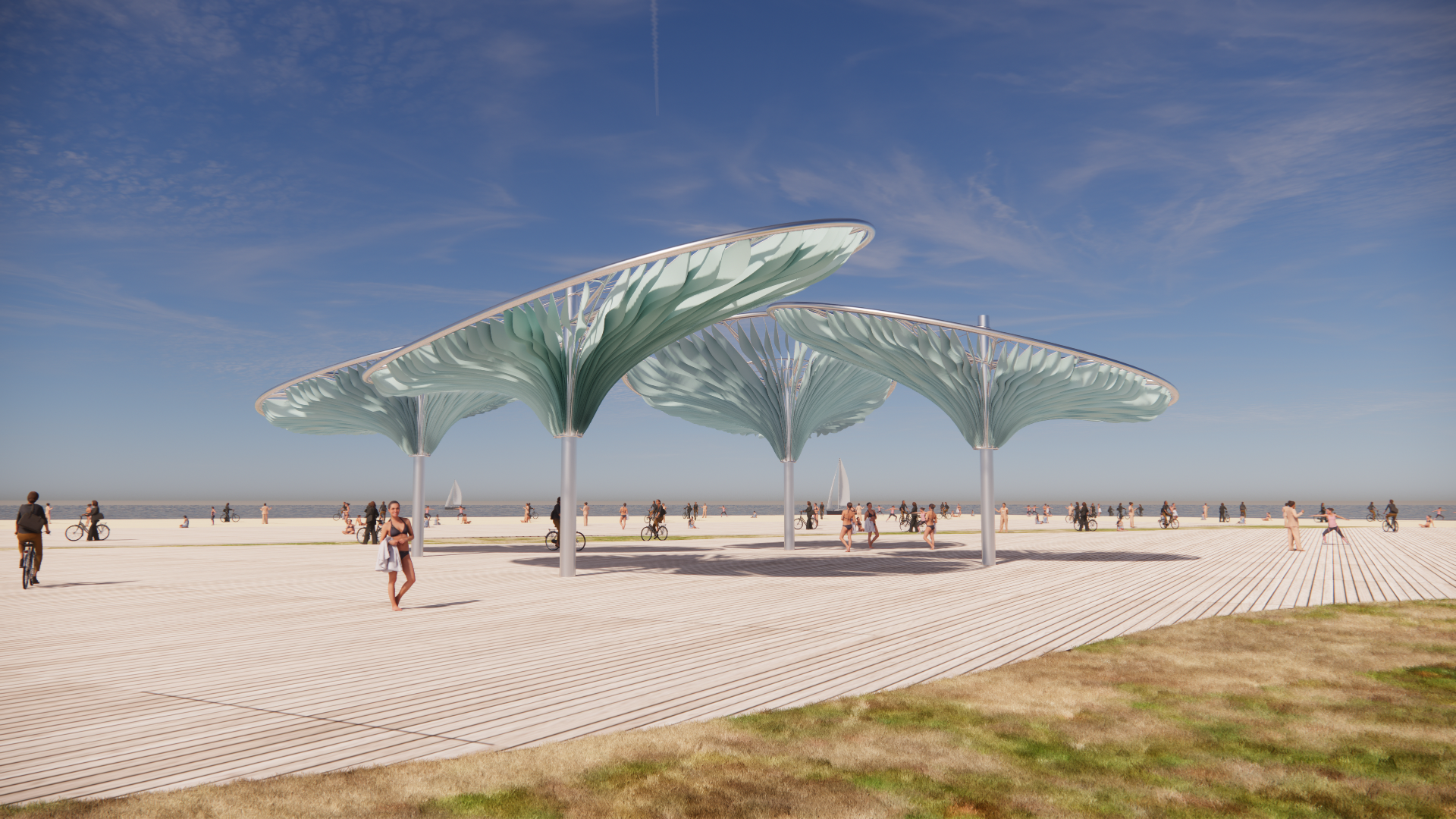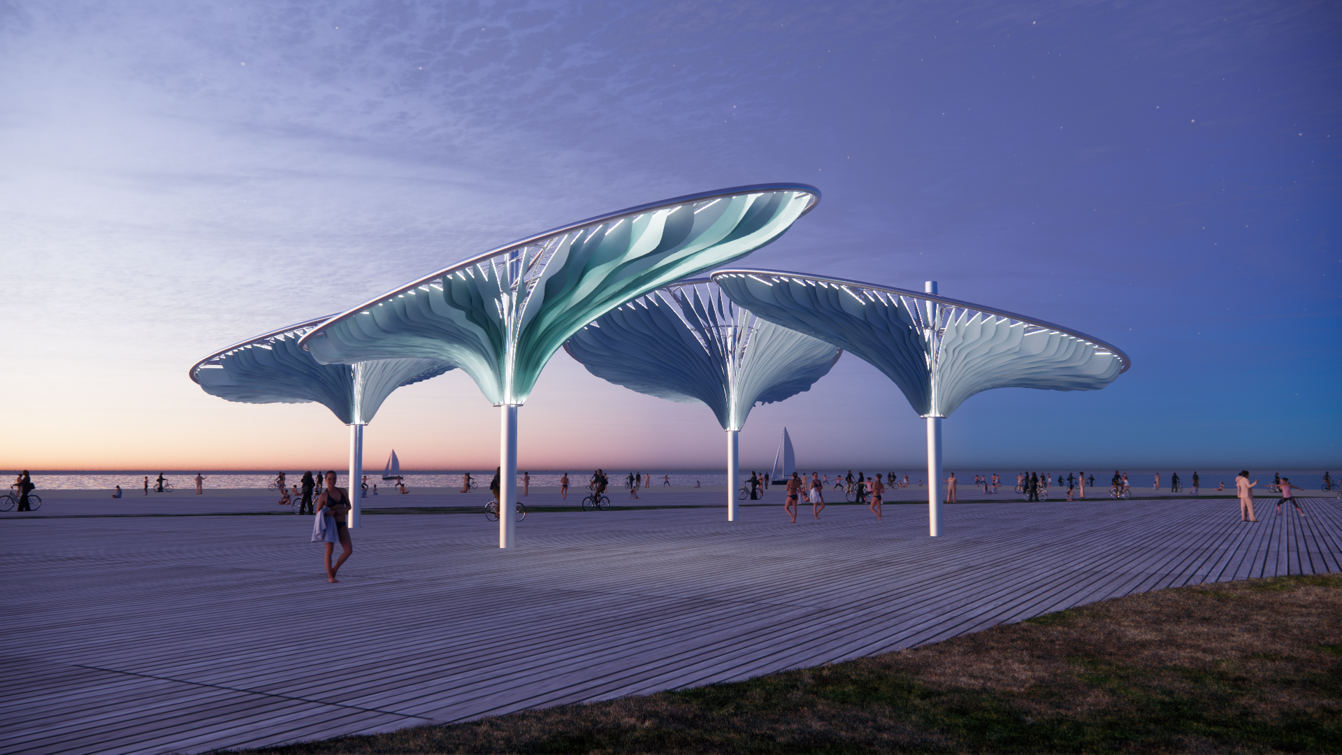 A canopy installation designed as a series of four steel-framed structures that provide shade and visual rhythm along the beachfront. Each canopy integrates tensioned fabric panels that hang softly from the frame, illuminated by concealed lighting within the structural pipes.