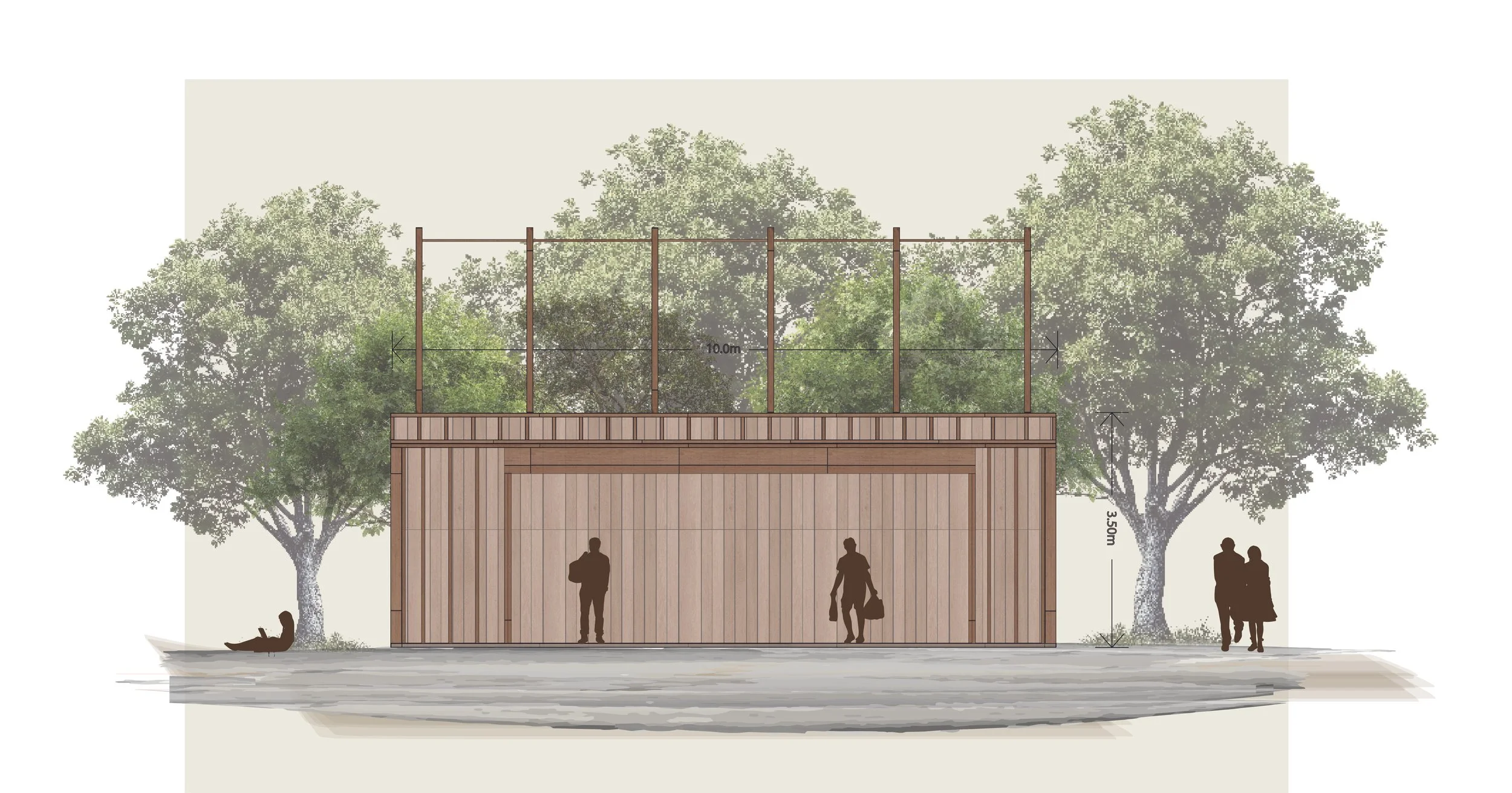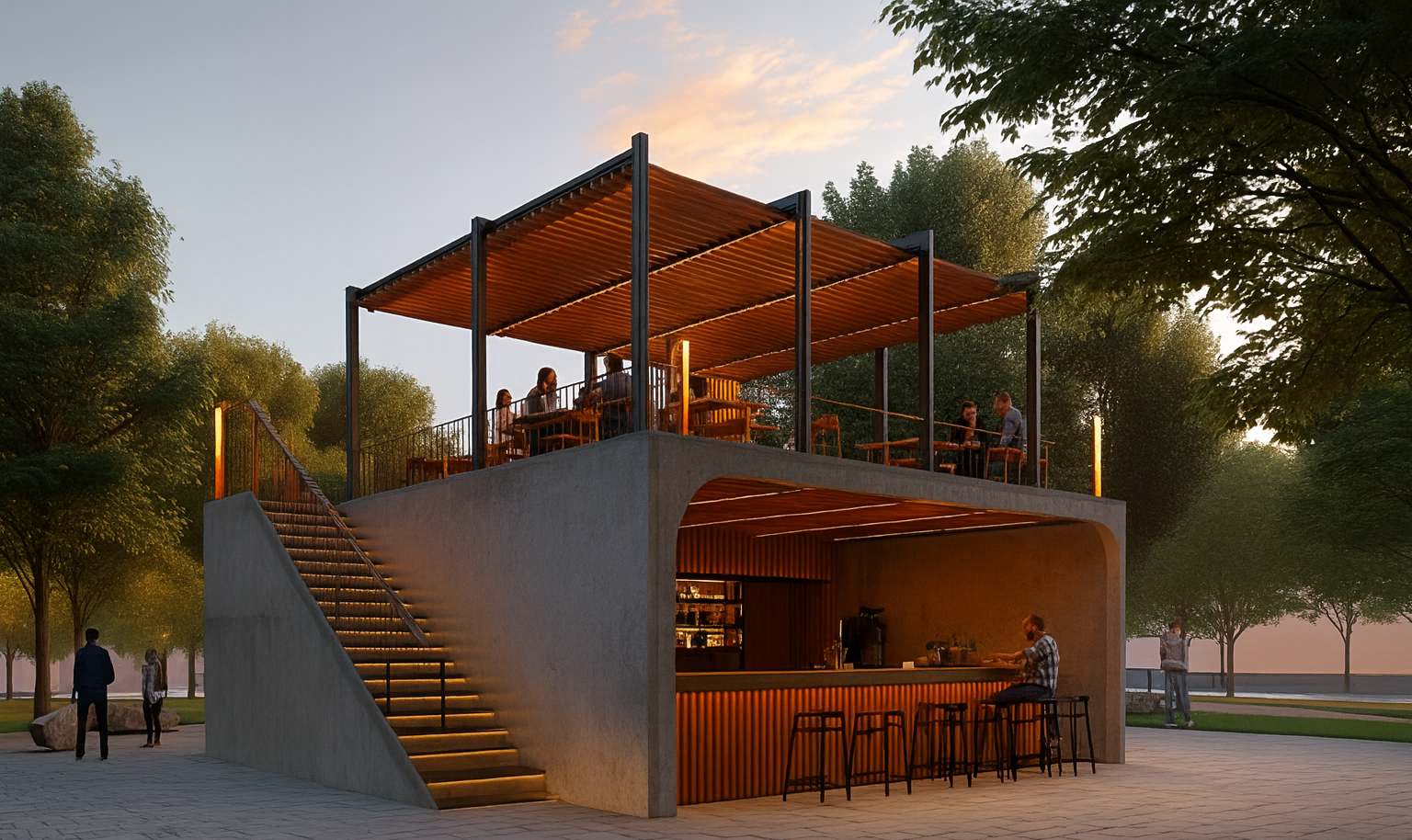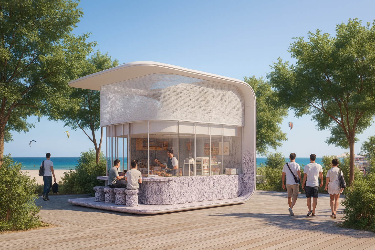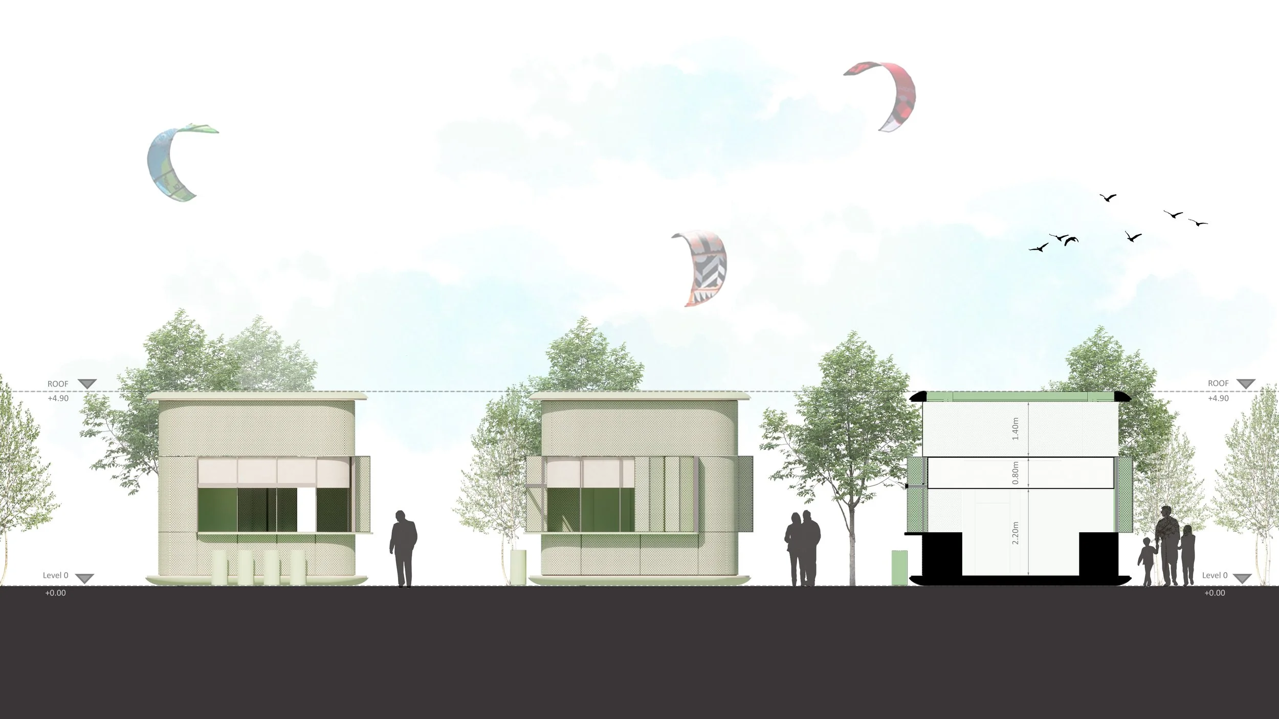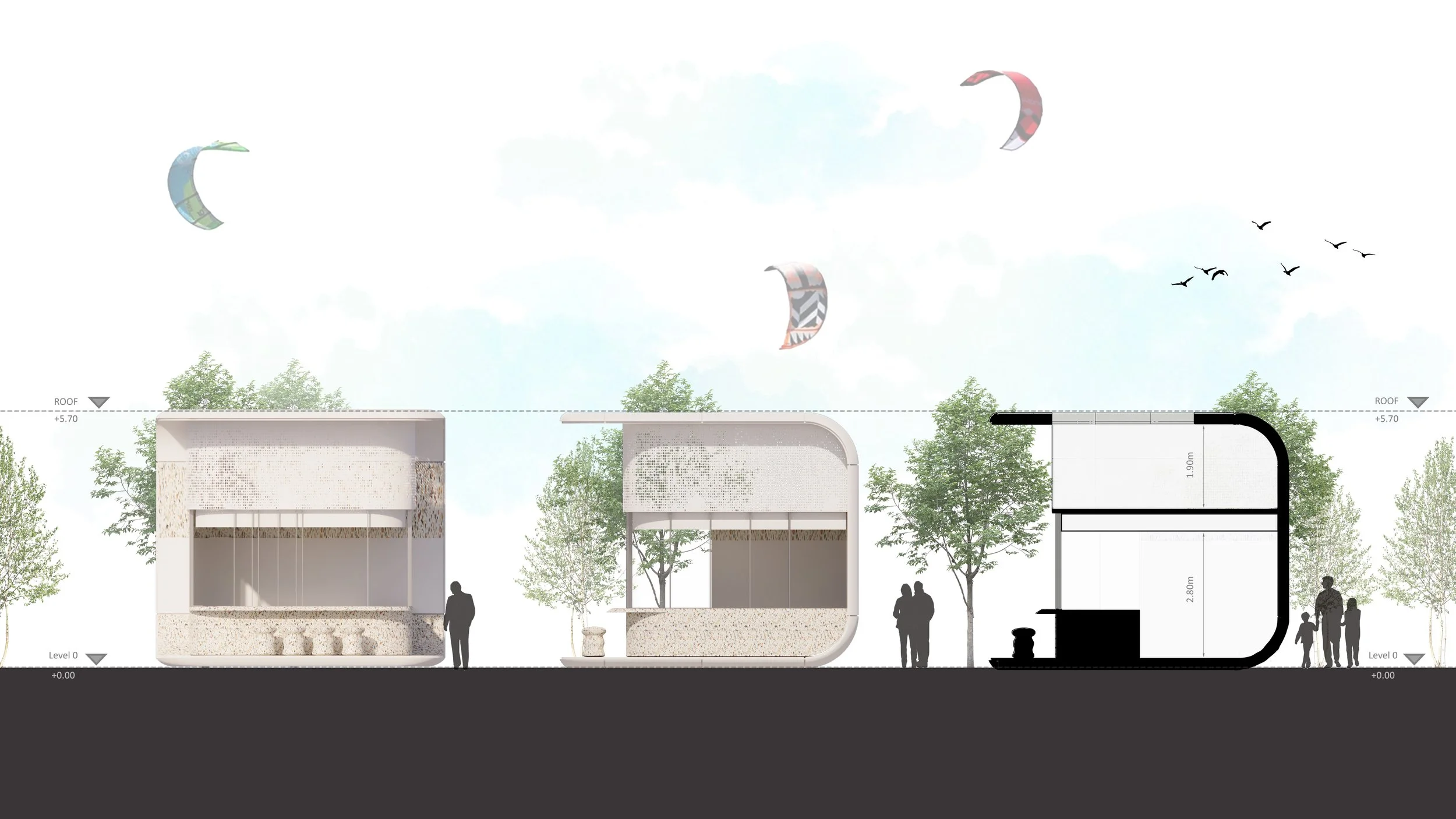 Designed as compact seaside cafés, these kiosks create inviting social spaces within a minimal footprint. The curved form and perforated exterior surfaces soften the architectural expression, filtering sunlight while blending seamlessly with the coastal landscape.