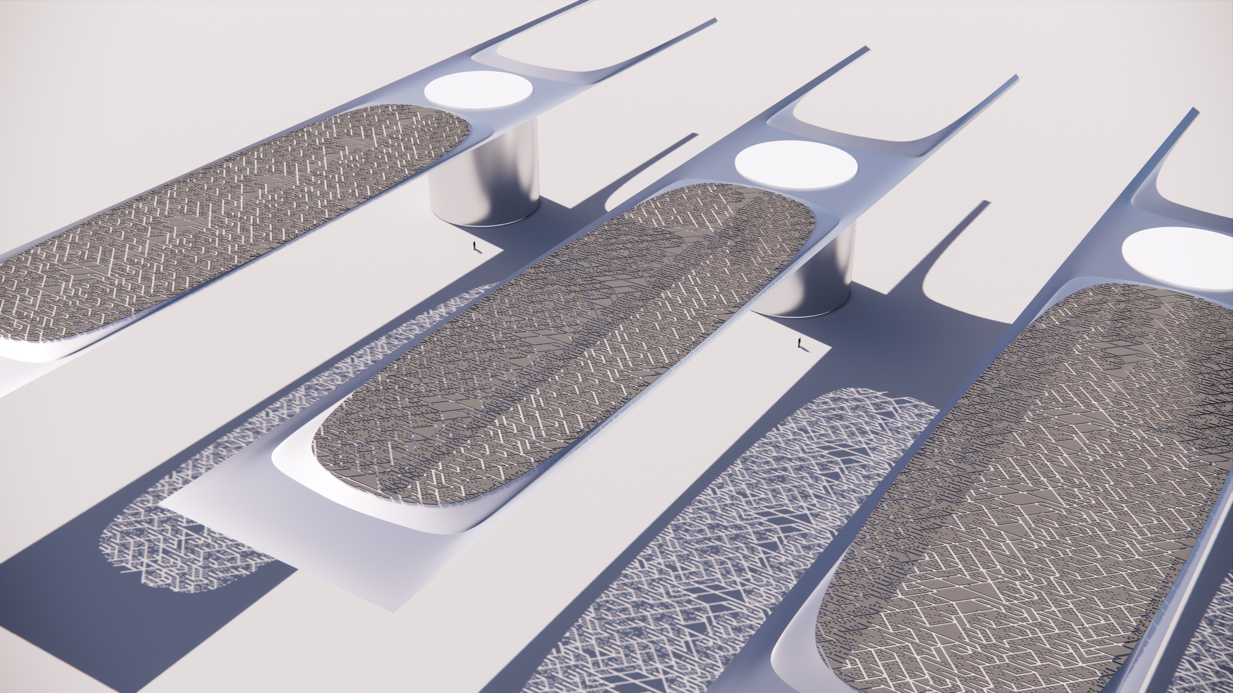 The first project develops a ceiling baffle system for an airport, where varying perforation parameters modulate natural light to create a dynamic interplay of illumination and structure.