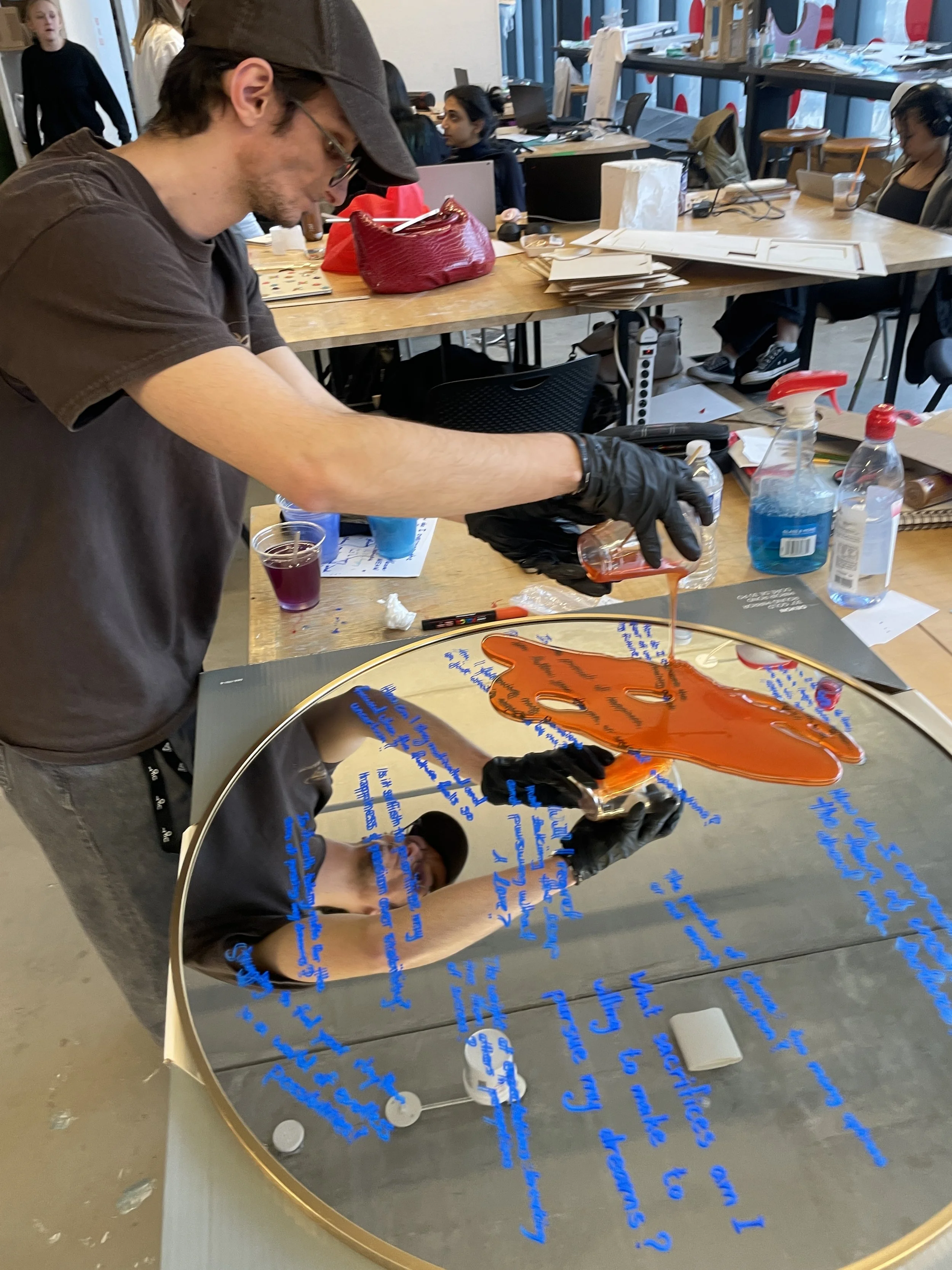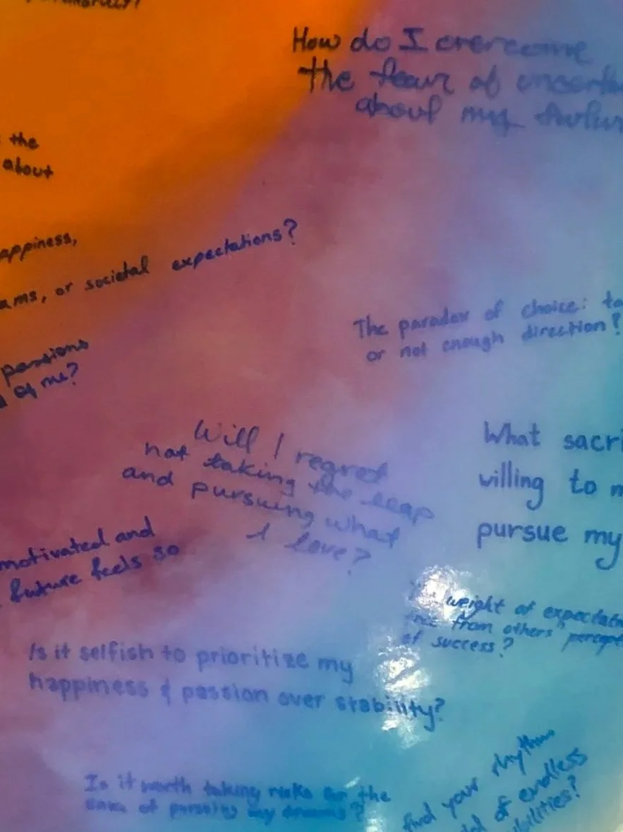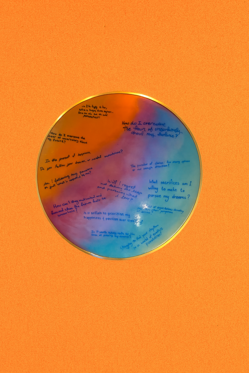 These reflections were written onto a mirror to emphasize self-reflection, then layered with paint and resin to create a soft, dreamy blur. As viewers approach the work, they can read fragments of these concerns while faintly seeing their own reflection behind them, inviting a moment of connection with the universal fears and possibilities that shape the transition into adulthood.