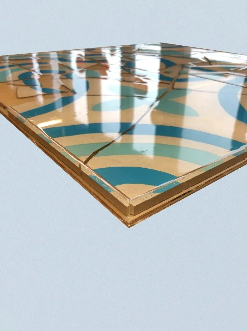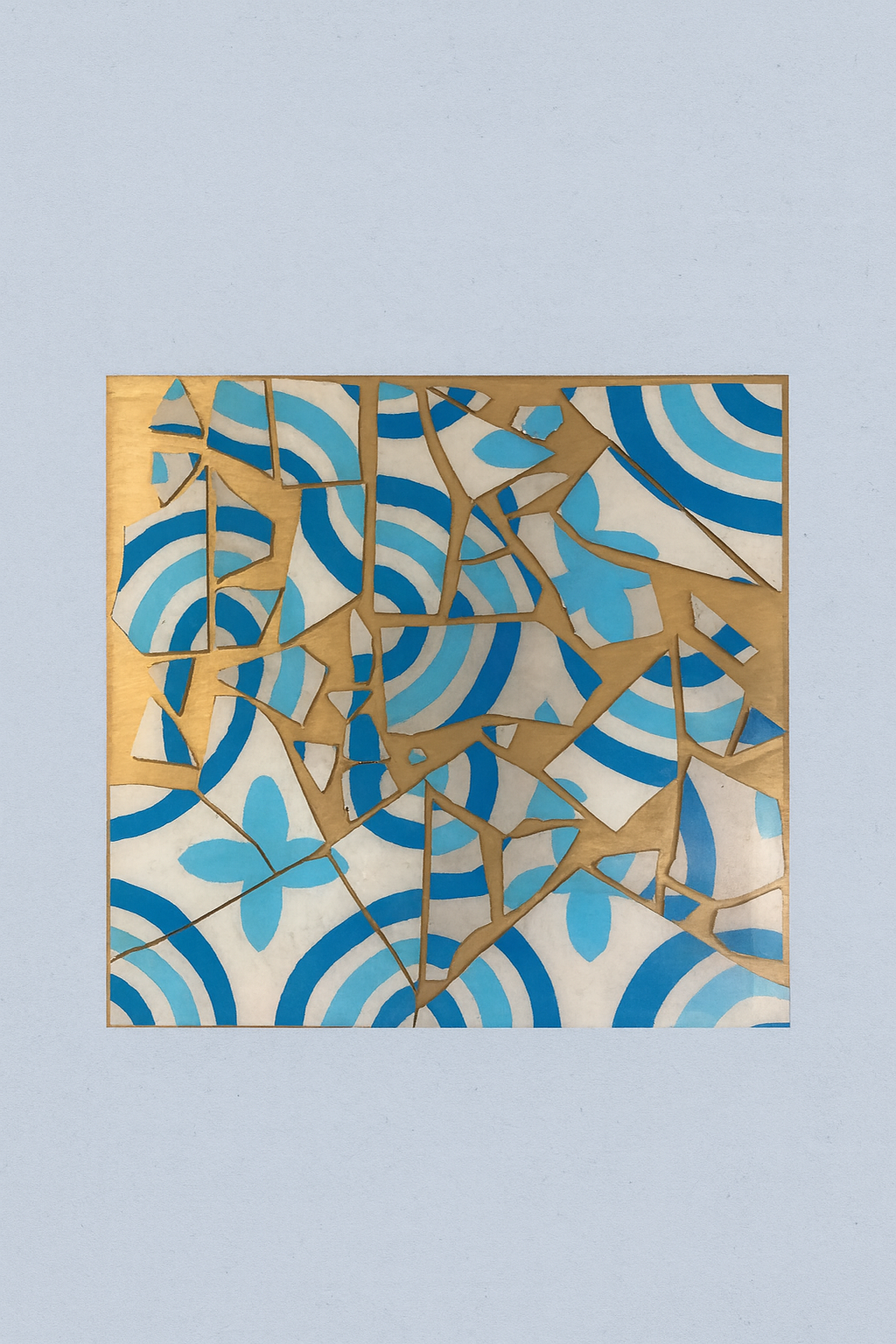 This piece begins with patterns inspired by traditional Turkish tiles—motifs I grew up around in Istanbul. After creating the designs on ceramic tiles, I broke them into fragments of different sizes, shuffled them, and reassembled them into a new composition. The cracks, edges, and shifting geometry reflect both disruption and continuity, held together under a smooth layer of resin that “freezes” the moment of transformation.